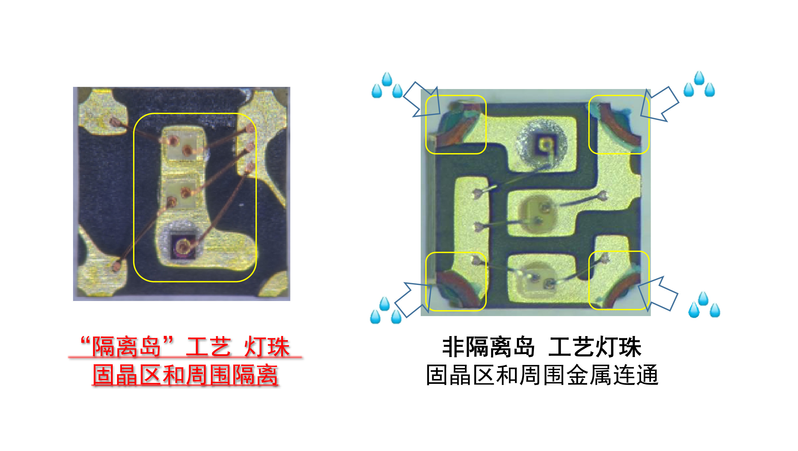 采用“隔離島”技術的封裝工藝,讓中間固晶區和周圍管腳焊盤無直接連通,避免外部水汽進入燈珠內部,提升密封性與穩定性,有效預防死燈和毛毛蟲故障現象。