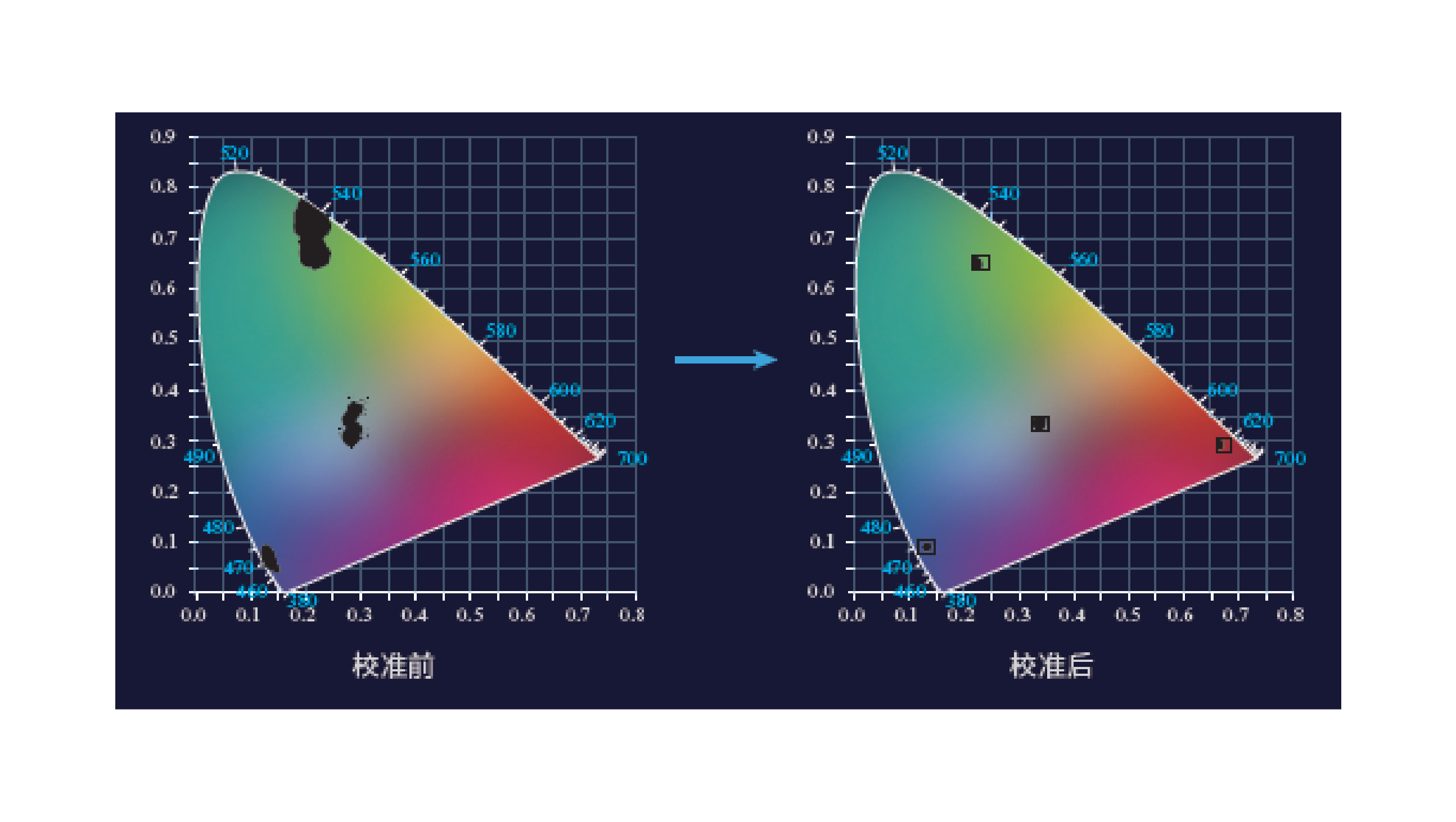 在校準暗室中使用高感光度相機,對單個像素進行顏色和亮度校準,像素間亮度差異控制在2%