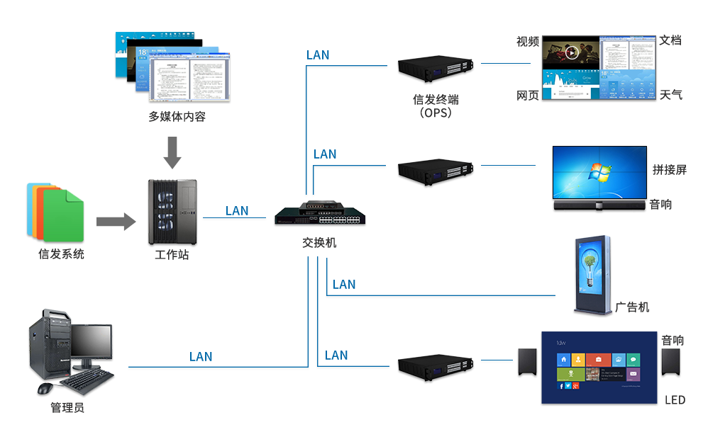 企業(yè)辦公信息發(fā)布系統(tǒng)總共分為5個(gè)部分,分別為:信息管理端、工作站、局域網(wǎng)、信息發(fā)布端及顯示終端。這一個(gè)完整的系統(tǒng)可將視頻、圖片及文字統(tǒng)一調(diào)配分別投放在各顯示終端。此外,顯示終端還能開(kāi)發(fā)更多功能,例如用戶可在顯示終端實(shí)現(xiàn)反向控制對(duì)系統(tǒng)信息作出反饋等。