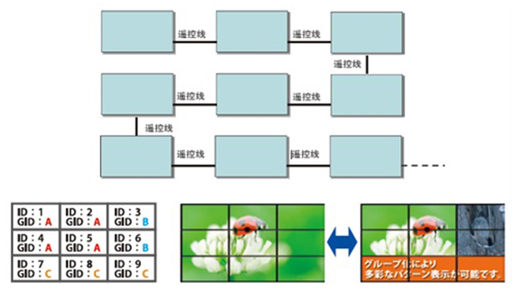 V系列顯示器支持遙控串聯(lián)功能,通過(guò)NEC的有線遙控輸入輸出接口,將顯示器用遙控線連接起來(lái),可以每臺(tái)顯示器自動(dòng)分配ID號(hào)碼設(shè)置,最大支持100臺(tái),既可以實(shí)現(xiàn)所有顯示器的共同遙控,又可以由遙控器對(duì)單獨(dú)的顯示器進(jìn)行控制和調(diào)整。?