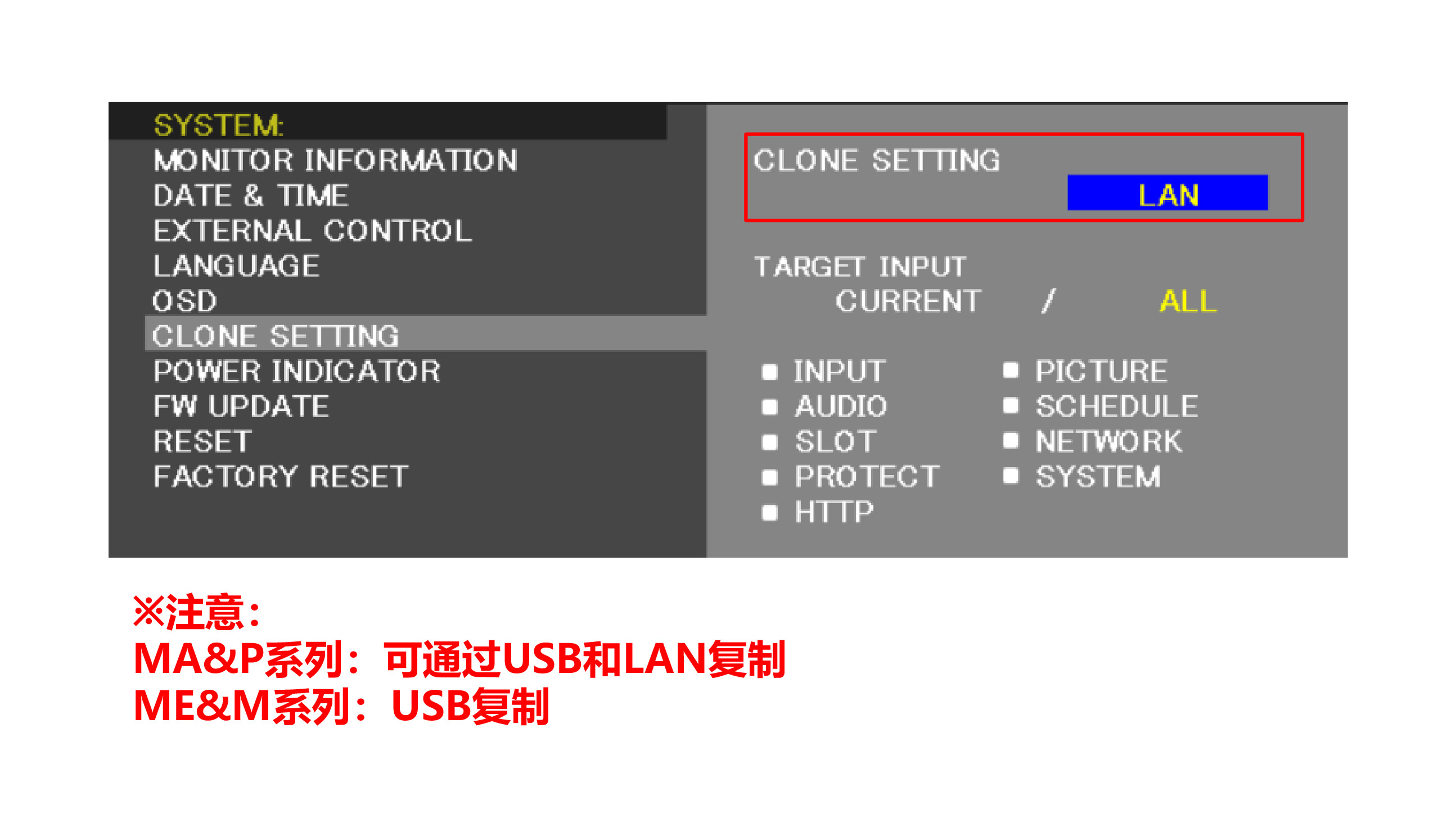 通過(guò)U盤或LAN,可將目標(biāo)顯示器的參數(shù)復(fù)制到指定顯示器